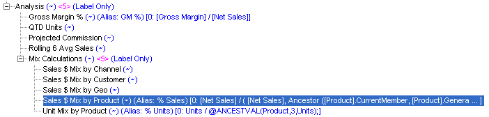 Double-click Sales $ Mix by Product, then edit member properties to replace the formula "Net Sales" / @ANCESTVAL(Product,3,"Net Sales"); with [Net Sales] / ( [Net Sales], Ancestor ([Product].CurrentMember, [Product].Generations(3) ) ).