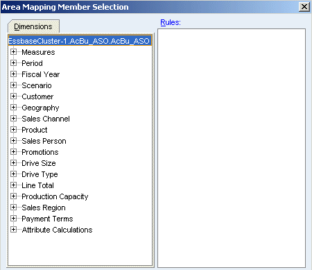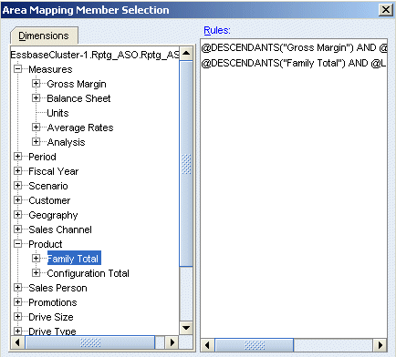 The Measures dimensions in the Rptg_ASO and Fcst_BSO outlines are different, except for member Gross Margin and its descendants, which are identical. ASO targets can be partitioned only along level 0 members. So, to define the source area to match the target (defined in the next topic), you select Measures to include the level 0 members of Gross Margin.