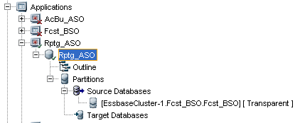 To provide forecast data to the reporting cube, you define a transparent partition between the source cube (Fcst_BSO) and the target cube (Rptg_ASO).