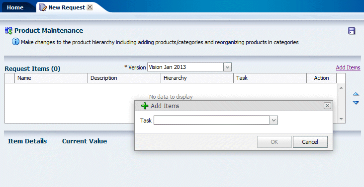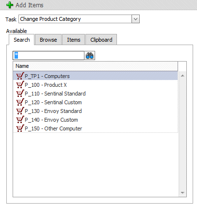 Click Add Items to add a request item and then select the Change Product Category task from the Task drop-down list.