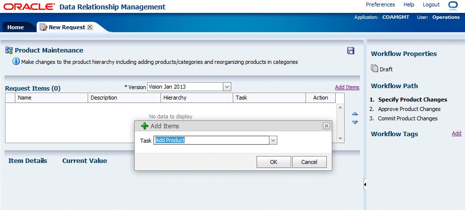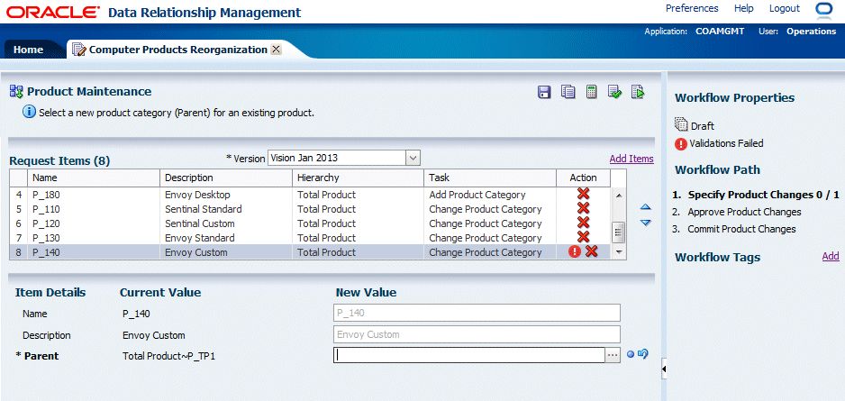 This tutorial demonstrates the submission, review, pushback, correction, and approval of a multiple item change request using an Oracle Data Relationship Governance workflow model.