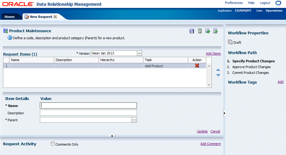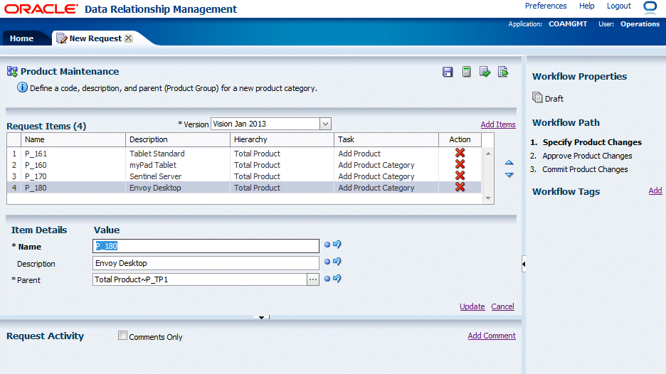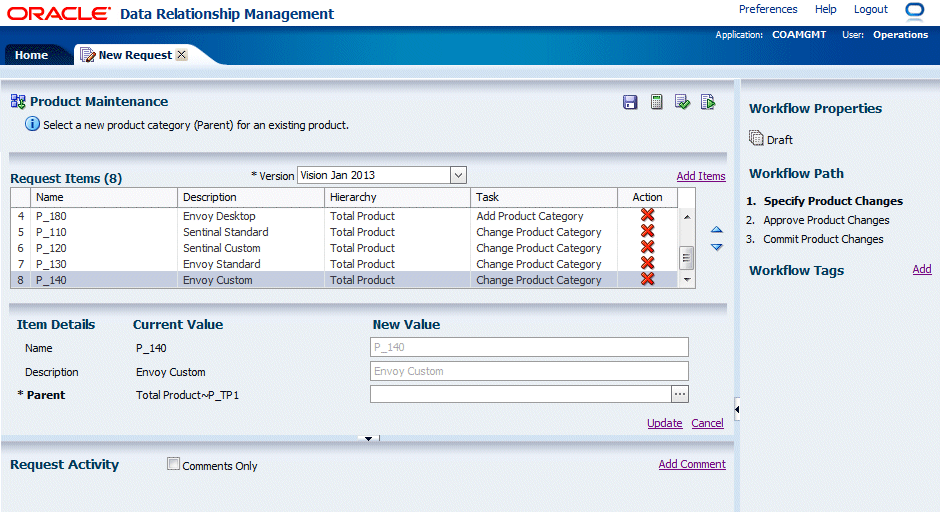 The Workflow Properties area displays that the request is claimed by user Operations and the request is in the initial workflow stage (Specify Product Changes).