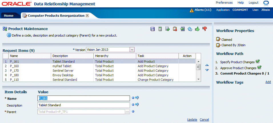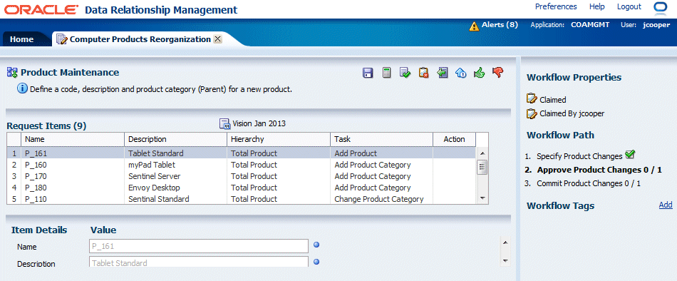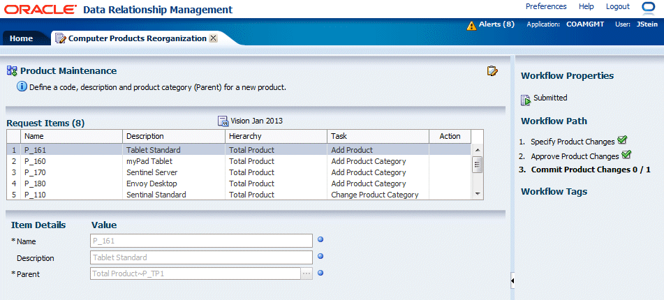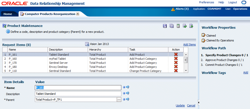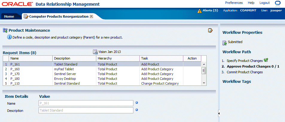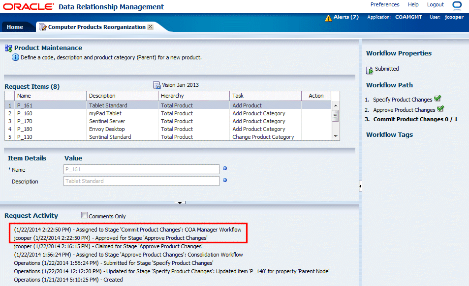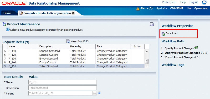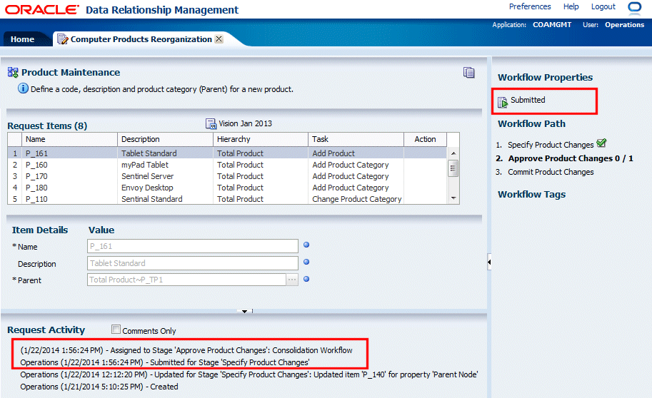 The Computer Products Reorganization request is opened on a new tab. Review the Item Details area for the P_161 request item. Note that the product is a tablet product but its Parent is not the new tablet product category (P_160).