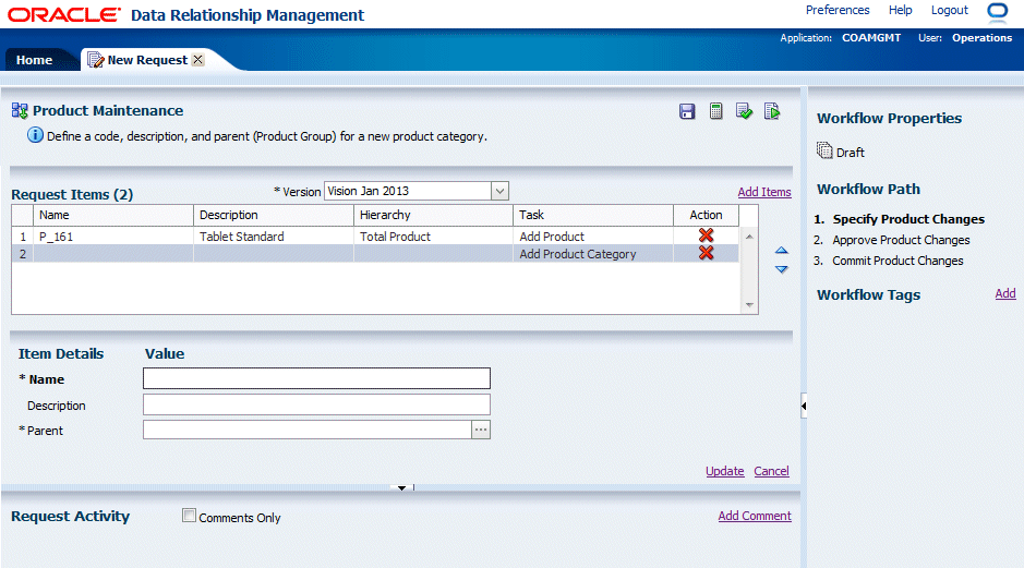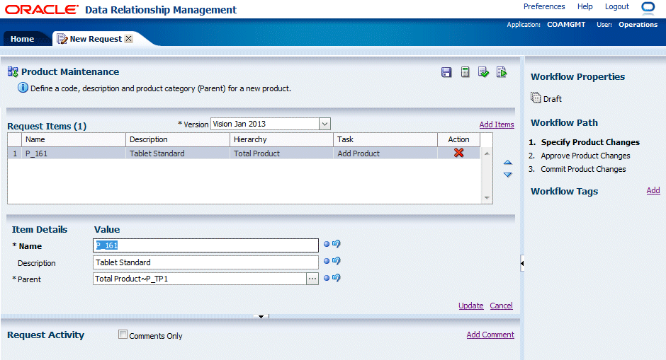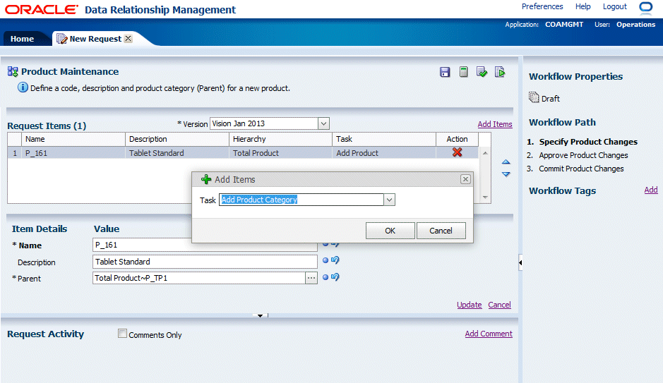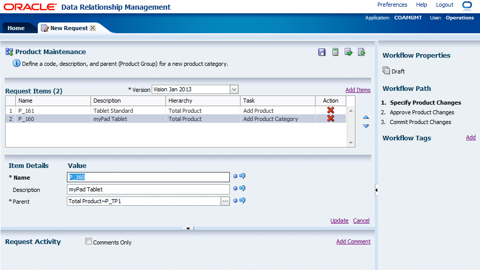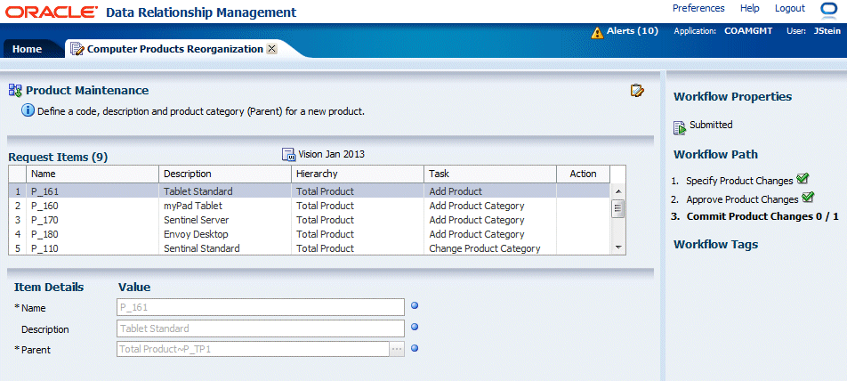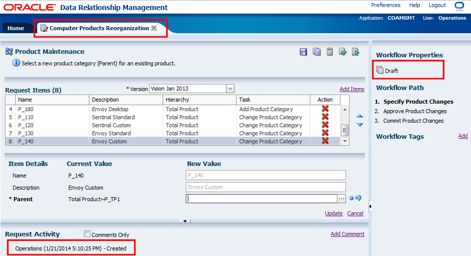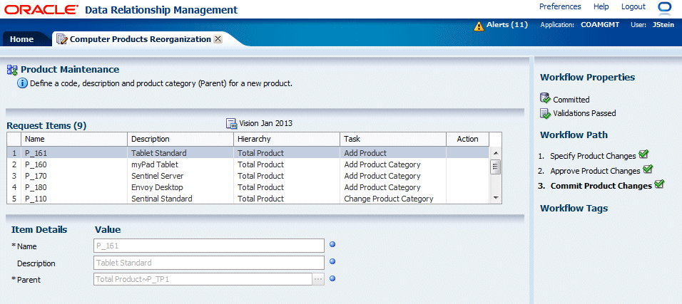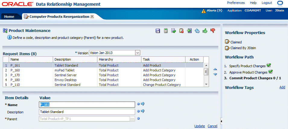 The Computer Products Reorganization request is opened on a new tab. Review the Item Details area for the P_161 request item. Note that the product is a tablet product but its Parent is not the new tablet product category (P_160).