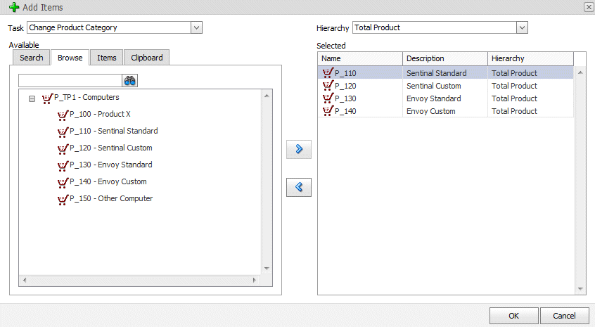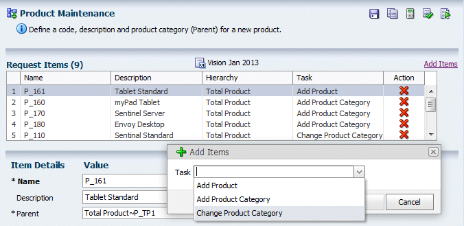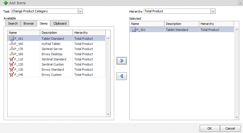 Select the Change Product Category task from the Task drop-down list, select the Items tab, and then select the P_161 item.