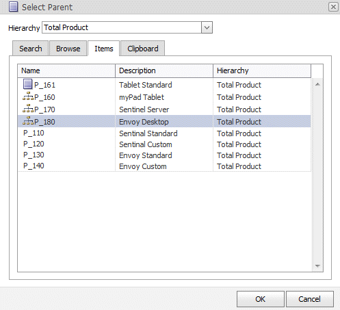 - Name = P_180, Description =Envoy Desktop, Parent = Total Product~P_TP1