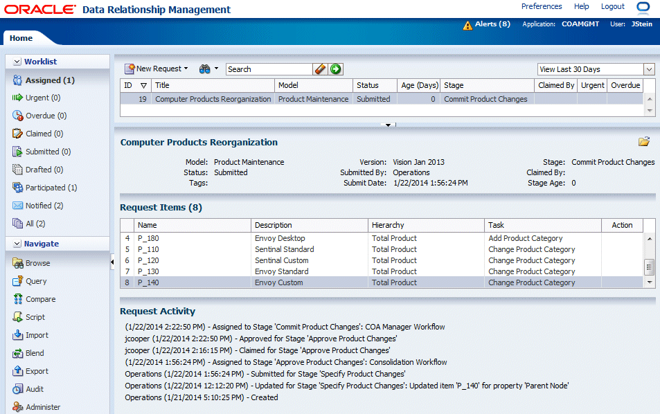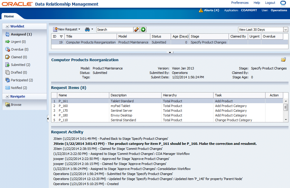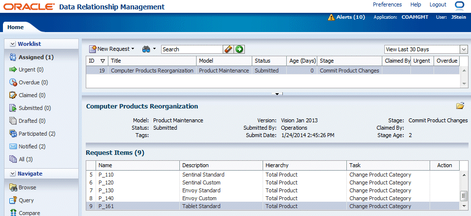 The Worklist page displays the assigned Computer Products Reorganizattion request and its summary.