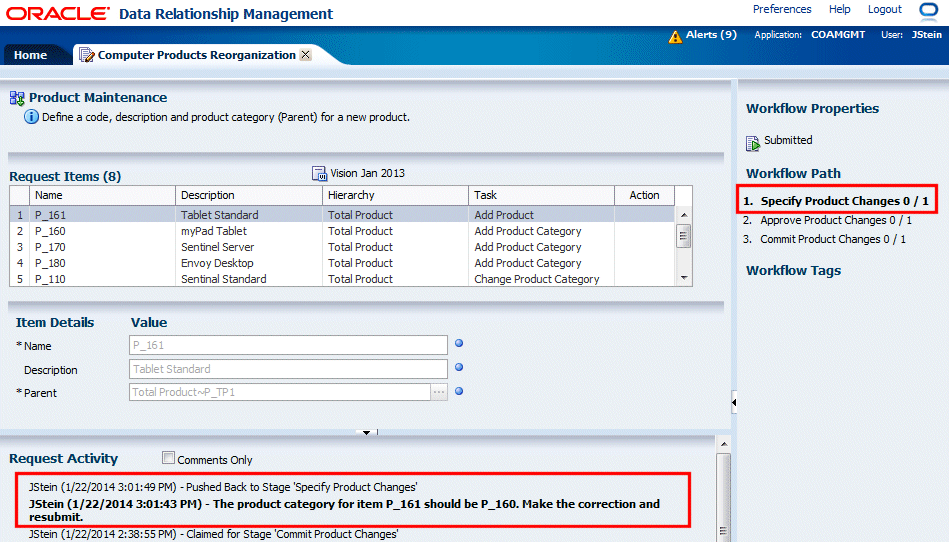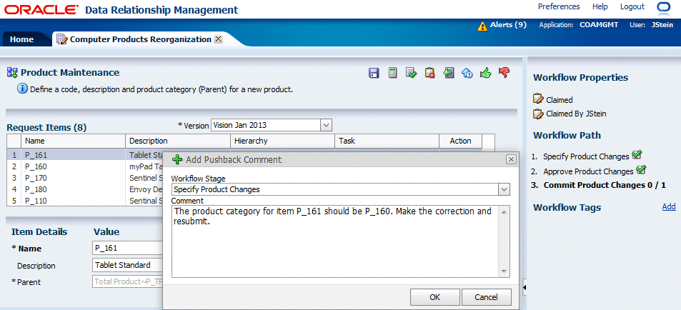 Select the Specify Product Changes stage as the target for the pushback and enter the reason for the pushback (for example, enter The product category for item P_161 should be P_160. Make the correction and resubmit.)