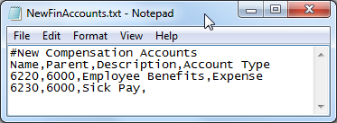 Open the saved source file in Notepad. This file is in a tabular, delimited format and contains four rows; a file description, column headers, and two financial accounts that need to be added to the COAMGMT Data Relationship Management application.