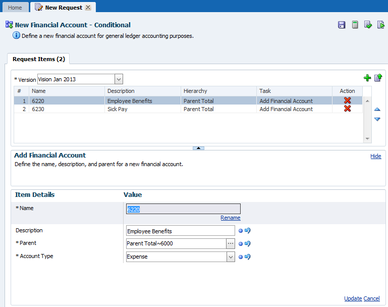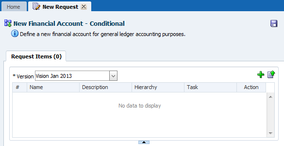 In this tutorial, you create a multi-item change request using the New Financial Account - Conditional workflow model to add two financial accounts for compensation expenses. You load the request items from a source file for the Add Financial Account workflow task, the first stage of the workflow model. You also review the task and the file to ensure that the file fields correspond to the task properties.