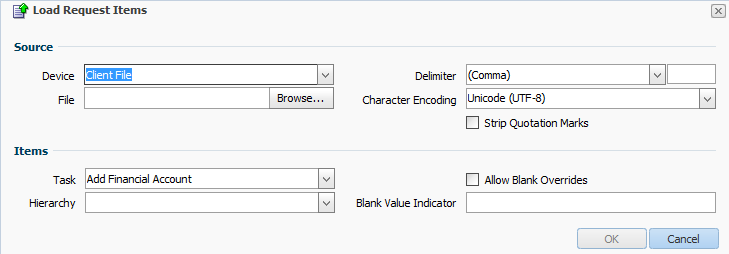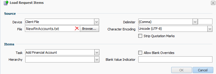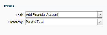 In the Items section, notice that the Add Financial Account is pre-selected for the Task drop-down list. This is the workflow task that is used for loading the request items from the file. The fields in the file correspond to the properties configured for the task. In the Hierarchy drop-down list, select Parent Total.