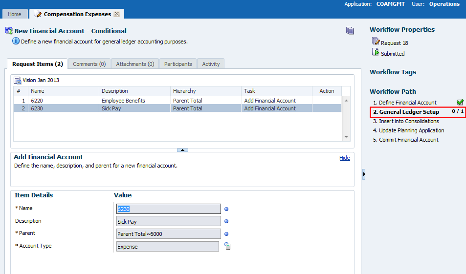 The request is submitted and assigned to the General Ledger Setup workflow stage.