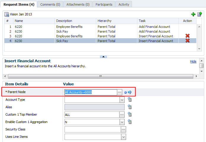 The default value for the Allow Posting and Allow Budgeting properties is True. Keep these values as True for the first request item (6220). For the second item (6230), set the Allow Budgeting property to False. The values of these properties will control which workflow stages the request must go through in order to be committed to the version.