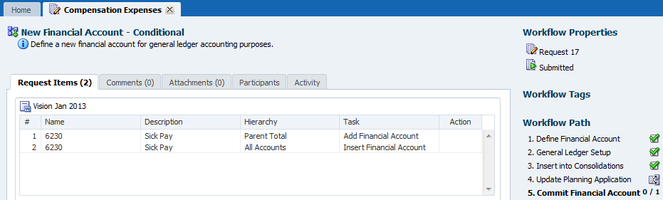 In this tutorial, you process the Compensation Expenses change request to add two financial accounts (6220 and 6230) into two hierarchies (Parent Total and All Accounts). As the first enrichment user, you set property values (Allow Posting and Allow Budgeting) that control whether the request enters or skips later workflow stages. The request enters the Insert Into Consolidation stage based on the property criteria (Allow Posting = True) and you add new request items to insert the financial accounts into an alternate hierarchy (All Accounts). The next workflow stage uses a conditional action to split the request items into separate requests where one request enters the Update Planning Application stage based on the property criteria (Allow Budgeting = True) and the other skips the stage. Finally, as the committing user, you individually approve the separate requests to commit all of the changes to the target version.