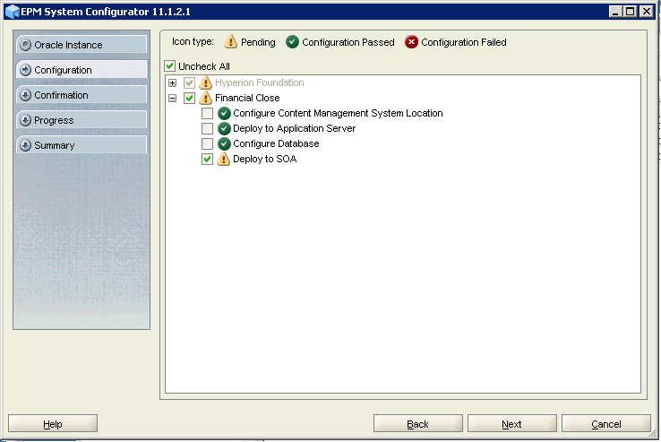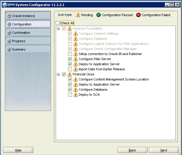 Accept the default options under Hyperion Foundation. For Financial Close, select Deploy to application server and Configure Database. Do not select Deploy to SOA. Select Configure Content Management System location only if you are using a content management system. Click Next.