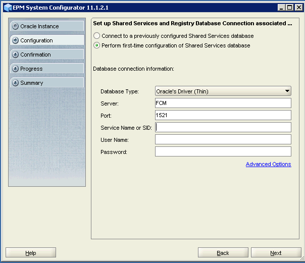 Select Perform first -time configuration of Shared Services database, enter the database connection details for the Shared Service database, and click Next.