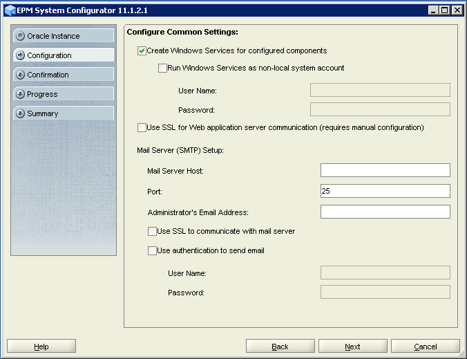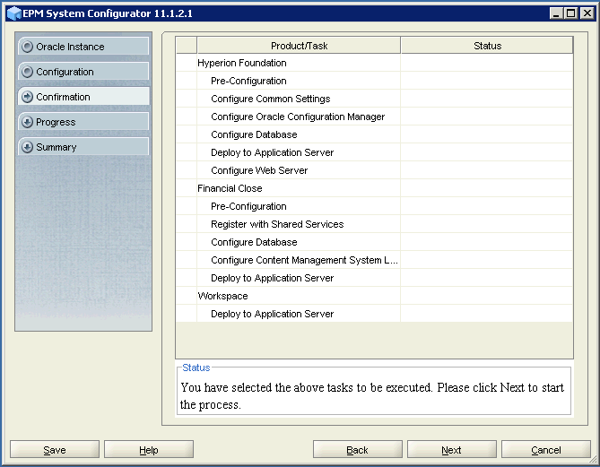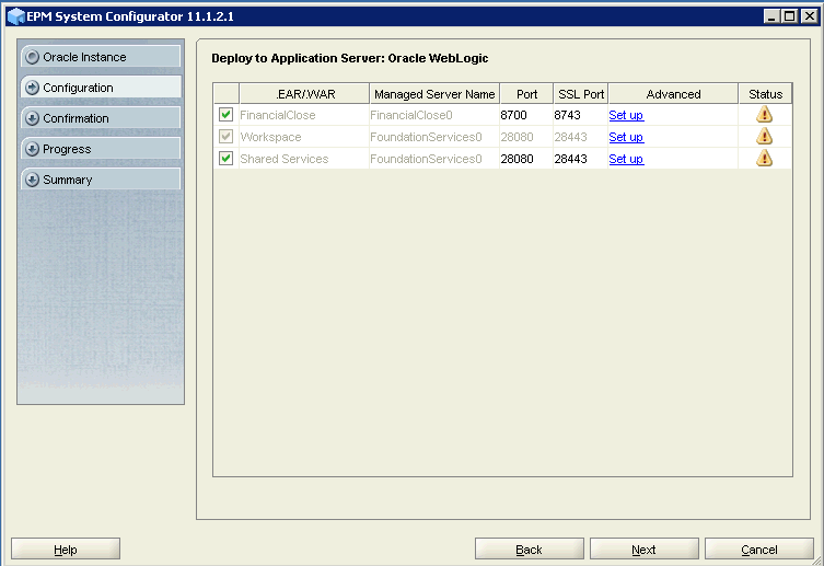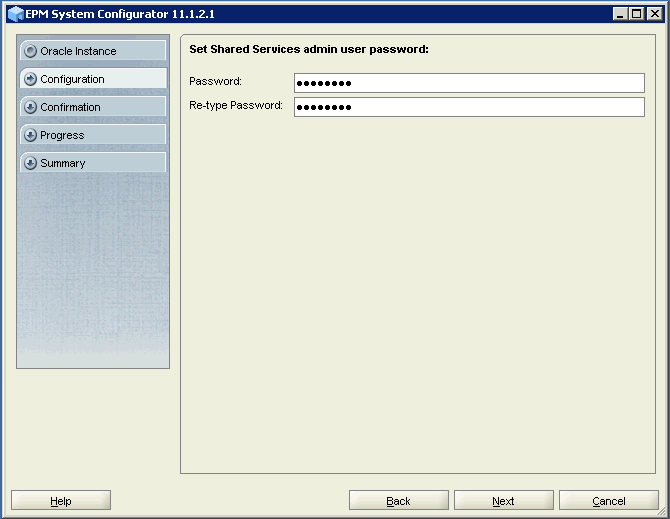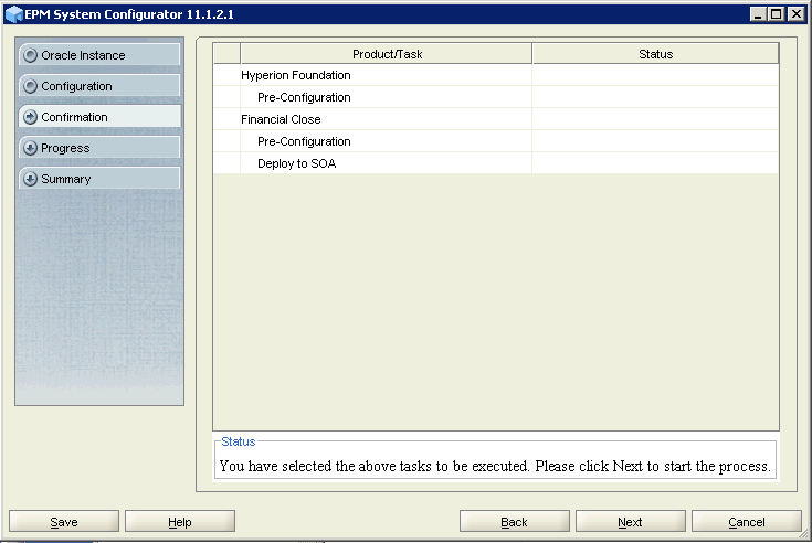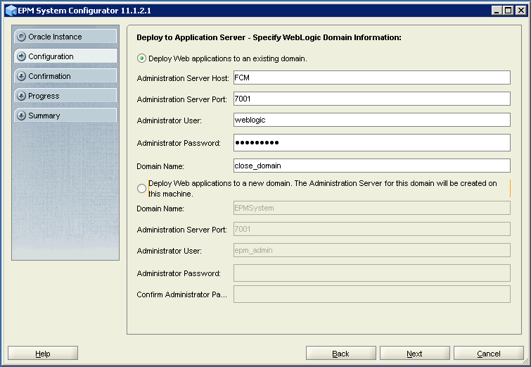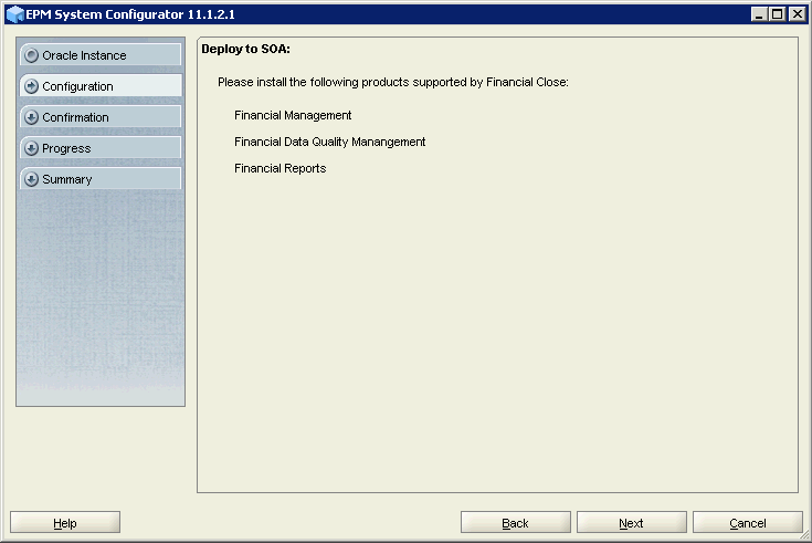 You must stop the WebLogic Admin server and SOA managed server before you configure the EPM components. The database schemas for the EPM components are created during the configuration process. During the configuration process you must provide valid Oracle database user names and passwords under which to create the schemas. You perform the Deploy to SOA configuration task after you restart WebLogic Server.