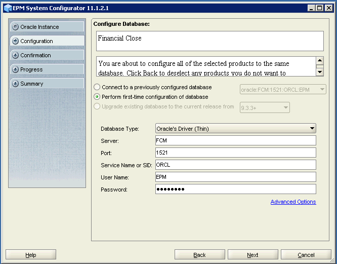 Select Perform first-time configuration of database, enter the connection details for the Financial Close Management database, and click Next.