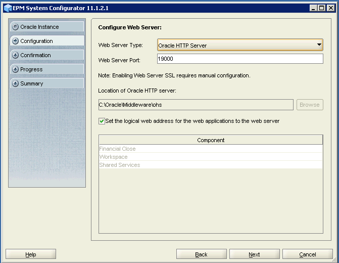 If you do not have an existing WebLogic installation, you may choose to install the EPM components first, because their install installs WebLogic automatically if it is not already present. Use the following installation and configuration sequence: