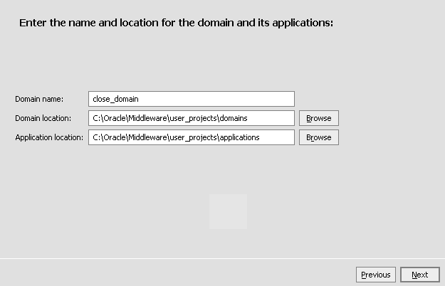 On the Specify Domain Name and Location screen, enter a domain name and accept the default locations. You must use the same domain name when you configure the EPM components. In this example, the domain name is close_domain.