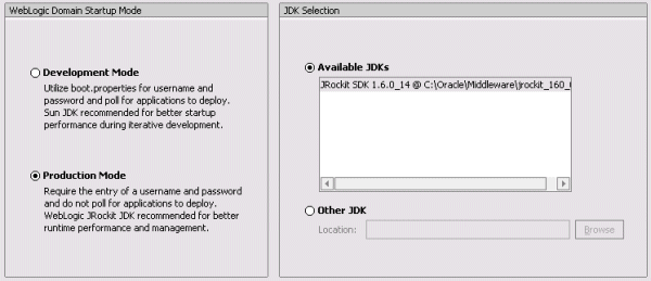 On the WebLogic Domain Startup Mode screen, select Production Mode, then select the Jrockit location, and click Next.