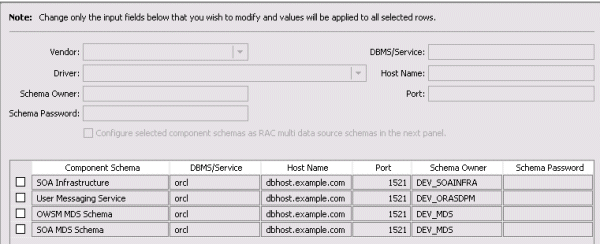 On the Configure JDBC Component Schema screen, select each component schema and provide the database connection information, using the schema password that you entered in the Repository Creation Utility. When finished, click Next.
