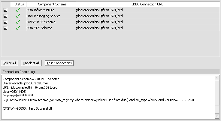 On the Test Component Schemas screen, verify that the connections to your data sources are successful, and click Next.