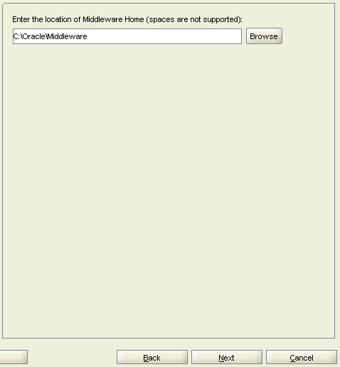 On the Destination screen, select the location for the Middleware Home directory, and click Next. The default directory is c:\oracle\middleware.