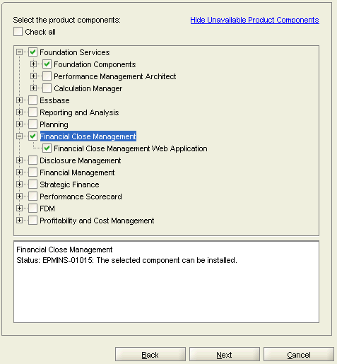 On the Product Selection screen, select Foundation Components and Financial Close Management Web Application, and click Next.