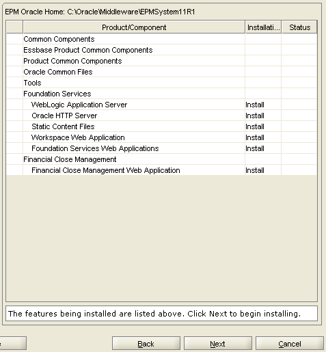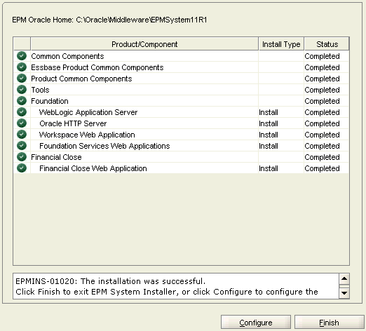 To install the EPM components, you run the Oracle Hyperion Enterprise Performance Management System Installer. Foundation Services and Financial Close Management are required components. If it is not already present, WebLogic is installed as part of the Foundation Services installation. You configure EPM components after you install and configure SOA Suite.