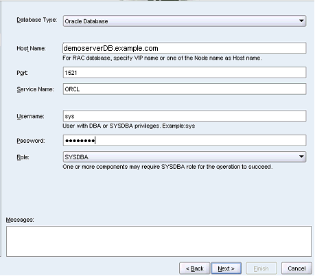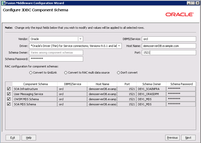 On the Configure JDBC Component Schema screen, select each component schema and provide the database connection information, using the prefix and schema password that you entered in the Repository Creation Utility. When finished, click Next. Example for Oracle database: