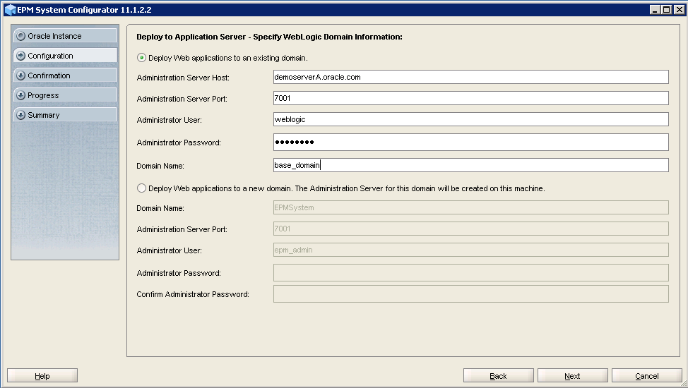 Select Deploy web applications to an existing domain, enter the information for the WebLogic domain