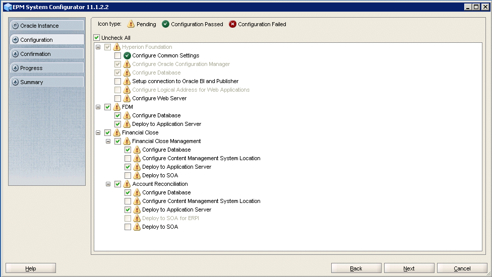 On the Product Selection screen: a. Deselect Check All. b. Under Foundation Services select Foundation Components c. Under Financial Close Management, select the components you want to install