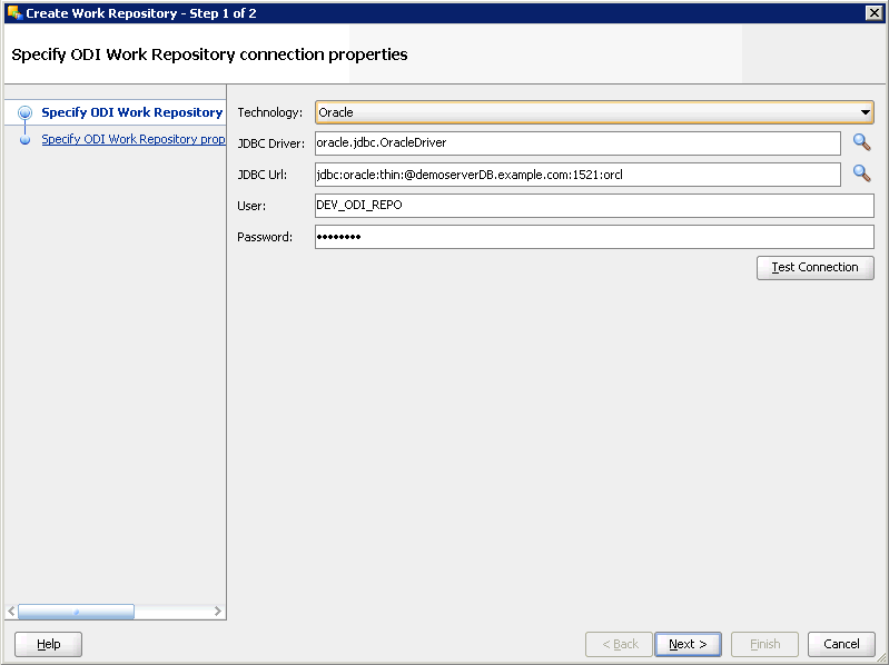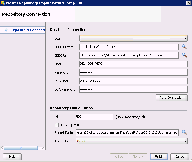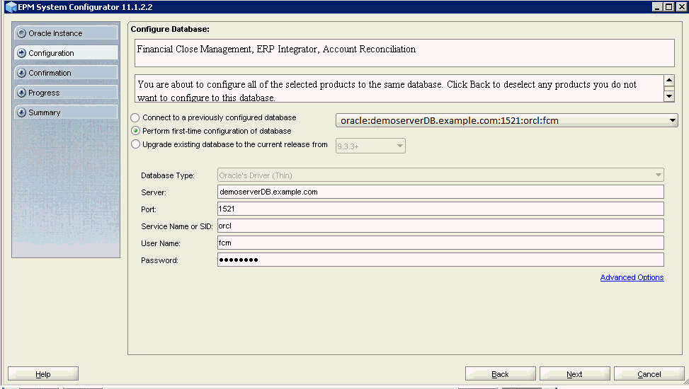 Select Perform first-time configuration of database, enter the connection details for the Example for Oracle Database: