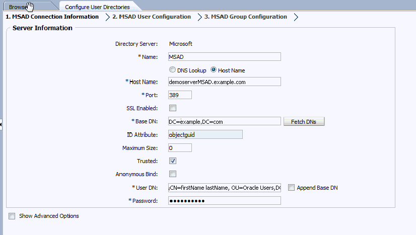 Select Perform first-time configuration of Shared Services database, enter the database connection Example for Oracle database (in this example, the user name is fcm):