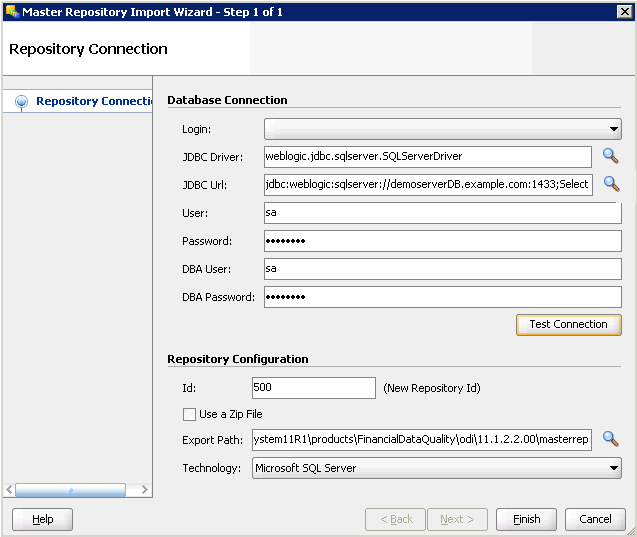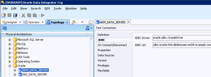 After you have imported Master and Work repositories, ODI has a base topology objects for ARM, ERPI, EBS, Peoplesoft and other supported servers.You must update the connection information for the server. For example, to use Account Reconciliation Manager , you need to configure ARM_DATA_SERVER and ERPI_DATA_SERVER. EBS_DATA_SERVER and PSFT_FMS_ DATA_SERVER are the most common severs you would want to configure.