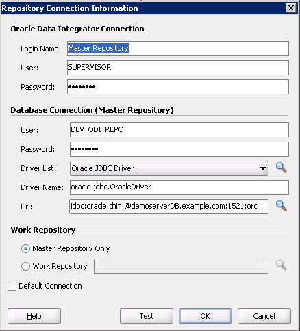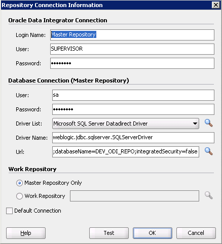 Set the following parameters in the odiparms.bat under the Oracle Example: set ODI_MASTER_DRIVER=oracle.jdbc.OracleDriver set ODI_MASTER_URL=jdbc:oracle:thin:@demoserverDB.example.com:1521:orcl (add your ODI master repository URL) set ODI_MASTER_USER=DEV_ODI_REPO (add your ODI master schema username) set ODI_MASTER_ENCODED_PASS=aYyHdZSEixcjzk2RGMi.iy (to get the encrypted password, see the instructions below) set ODI_SECU_WORK_REP=WORKREP ( your work repository name) set ODI_ADDITIONAL_CLASSPATH=%ODI_HOME%\..\..\oracledi.sdk\lib\* MS SQL Server Example: set ODI_MASTER_DRIVER=weblogic.jdbc.sqlserver.SQLServerDriver set ODI_MASTER_URL=jdbc:weblogic:sqlserver://demoserverDB.example.com:1433;SelectMethod=cursor;databaseName=DEV_ODI_REPO;integratedSecurity=false (add your ODI master repository URL. Note that databaseName is for your ODI database) set ODI_MASTER_USER=sa ( sa user) set ODI_MASTER_ENCODED_PASS=aYyHdZSEixcjzk2RGMi.iy (to get the encrypted password, see the instructions below) set ODI_SECU_WORK_REP=WORKREP ( your work repository name) set ODI_ADDITIONAL_CLASSPATH=%ODI_HOME%\..\..\oracledi.sdk\lib\*