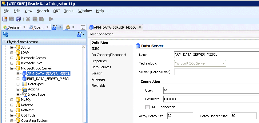 Repeat the same steps you did for ARM_DATA_SERVER for ERPI_DATA_SERVER and other Physical servers as needed. Example for EBS and Peoplesoft DB connections: