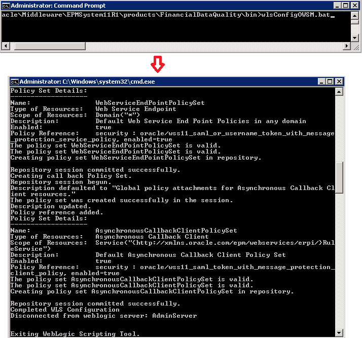 Run the wlsConfigOWSM.bat file (Machine B): From the same command prompt, run wlsConfigOWSM.bat file and ensure that the script runs successfully