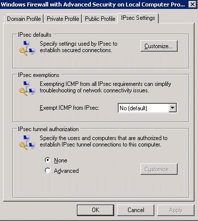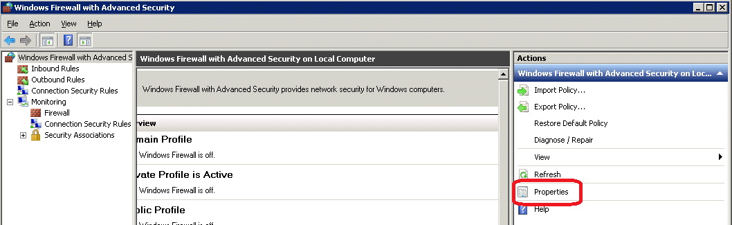 Select Start, then Administrative Tools, and then Windows Firewall with Advanced Security and click on Properties.
