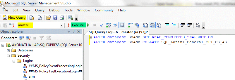 Modify the properties of the database for SOAdb: a. Click on the ‘New Query’ button in the upper left and choose ‘master’ database from the drop-down just below it. b. Enter the commands below. replacing <database name> with the SOA Database.ALTER database <database name> SET READ_COMMITTED_SNAPSHOT ON