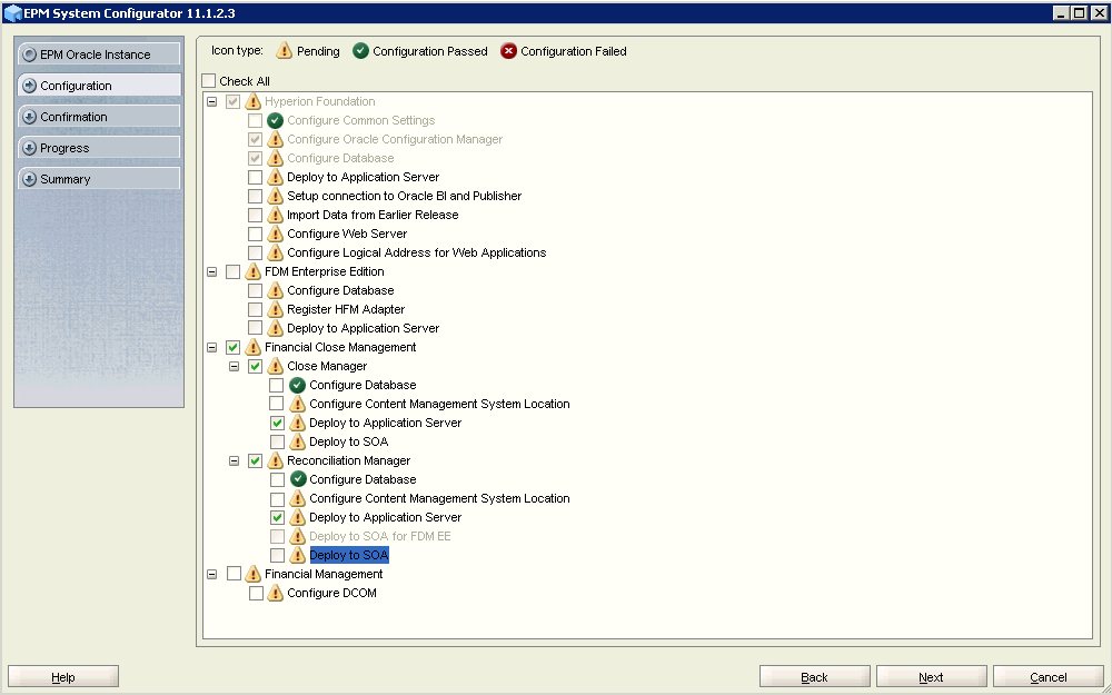 - Expand Financial Close Management and select Deploy to application server for both Close Manager and Reconciliation Manager. Do not select Configure Database, Deploy to SOA, or Deploy to SOA for FDMEE. Select Configure Content Management System location only if you are using a content management system.