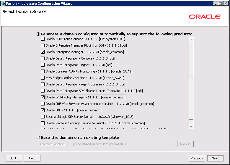 On the Select Domain Source screen, select Generate a domain configured automatically to support the following products, then select then select Oracle Enterprise Manager, Oracle WSM Policy Manager and Oracle JRF, and click Next.