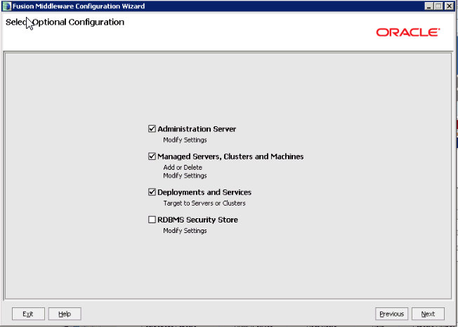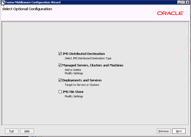In the Select Optional Configuration screen, select Administration Server; Managed Servers, Clusters, and Machines; and Deployments and Services.