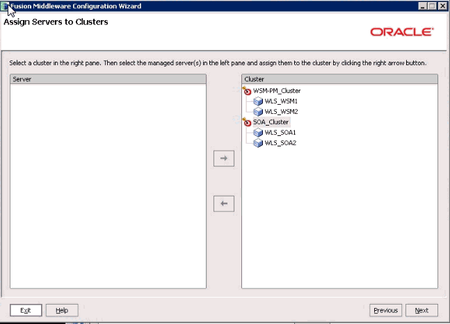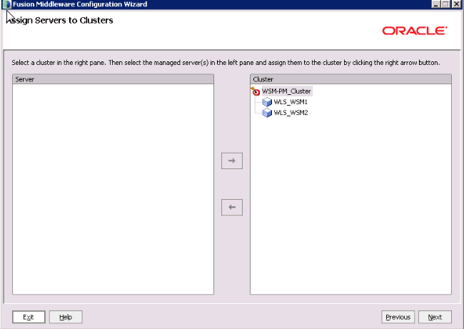 In the Assign Servers to Clusters screen, assign both WLS_WSM1 and.WLS_WSM2 to the WSM_PM cluster, and then click Next.