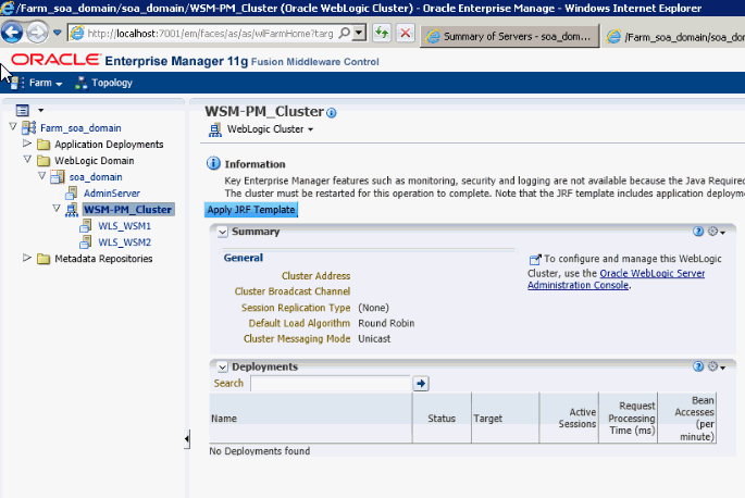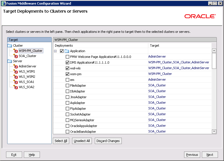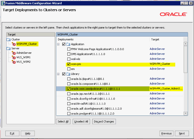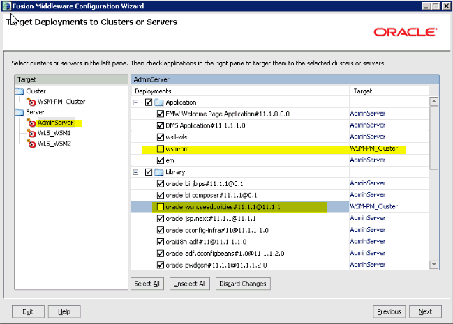 On the Target Deployments to Clusters or Servers screen, in the Target list select AdminServer, and in the right de-select wsm=pm and oracle.wsm.seedpolicies.Verify that, with the exception of wsm-pm and oracle.wsm.seedpolicies, all other application and seedpolicies are targeted only to Admin Server libraries, and then click Next.