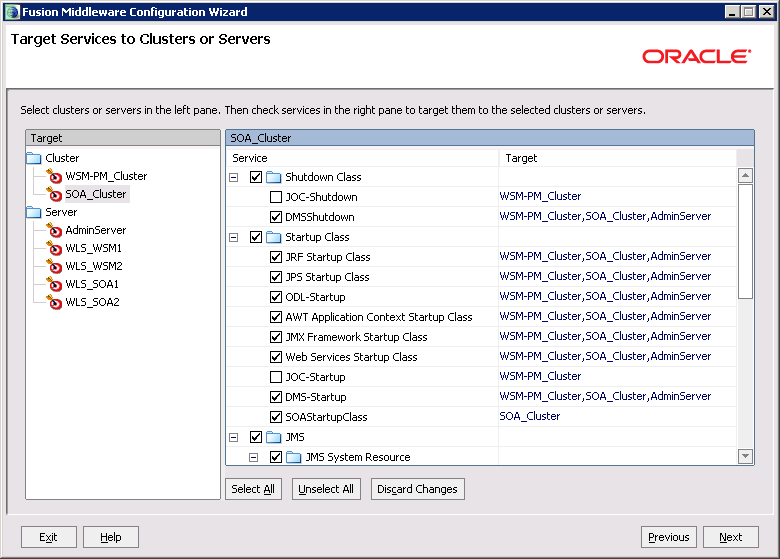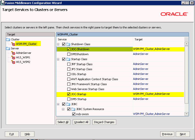 On the Target Services to Clusters or Servers screen, perform these steps to make sure the JOC-Shutdown and JOC-Startup services are targeted to the WSM-PM_Cluster and are not targeted to Admin Server: