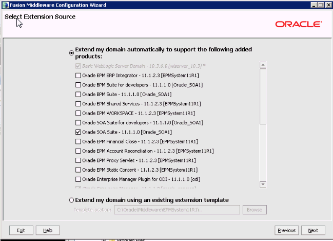 When you install SOA Suite, select the same Middleware Home directory that you specified for installing EPM Components. The Middleware Home directory contains the WebLogic installation, which is required for installing SOA Suite.