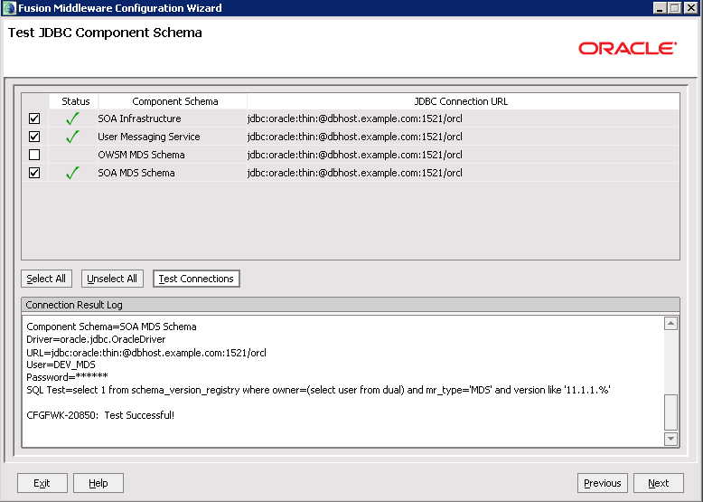 On the Configure JDBC Component Schema screen, select each component schema and provide the database connection information, Example for Oracle database: