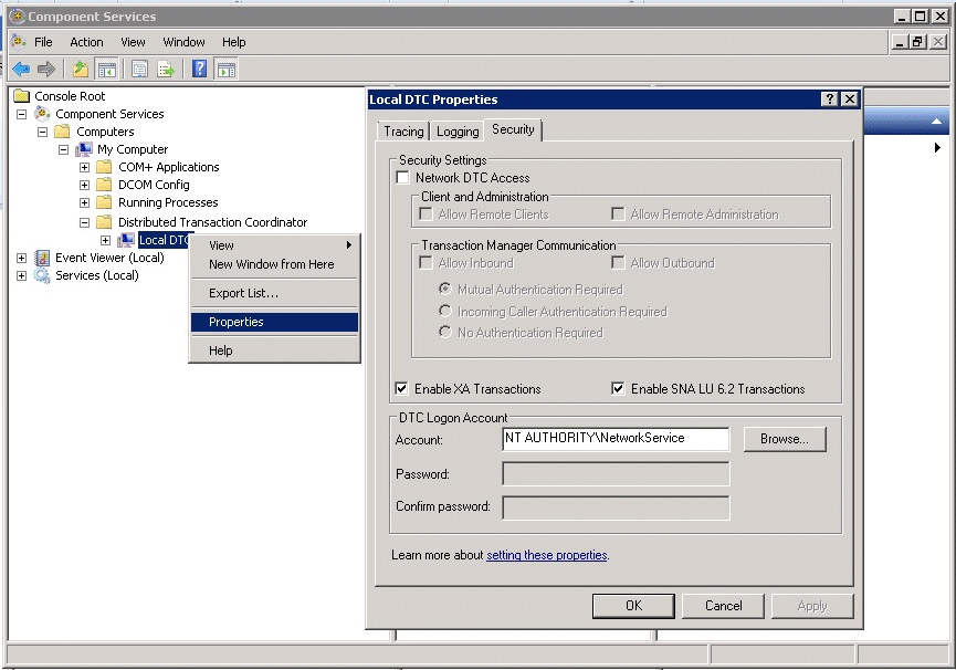 For Windows 2008: a. Select Start, then Programs, then Administrative Tools, then Component Services, b. Right Click Local DTC and select Properties c. Select the Security Tab and then select Enable XA Transactions d. Click OK
